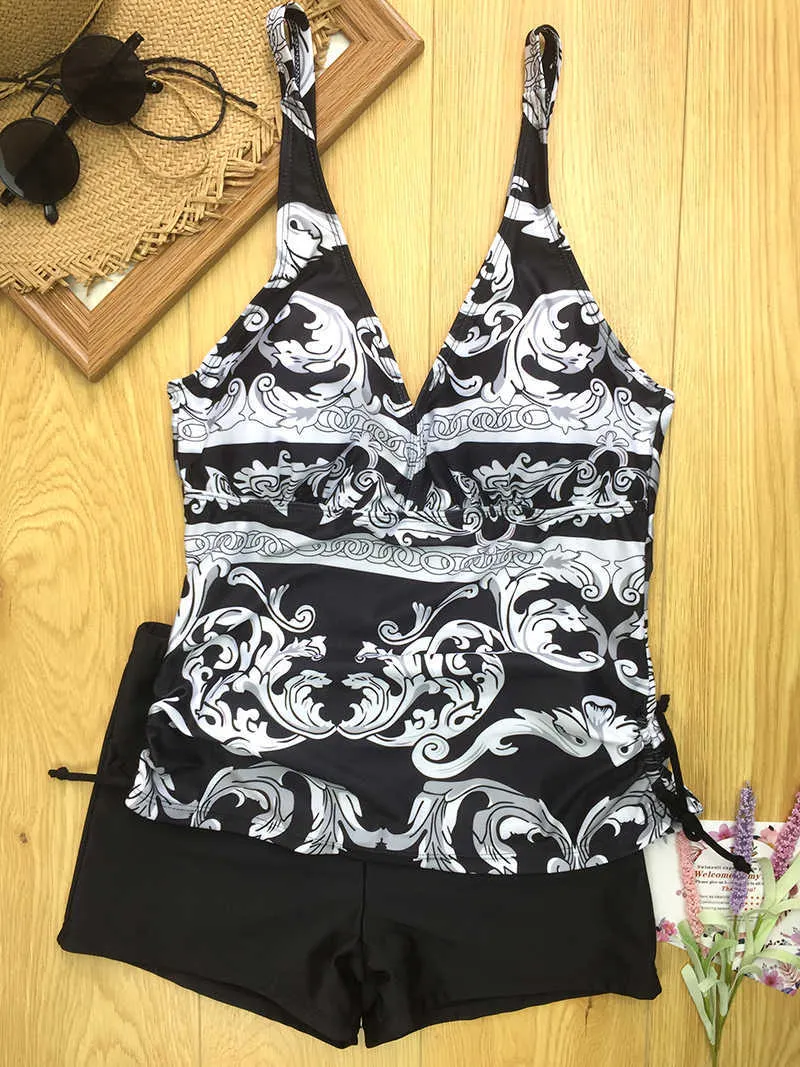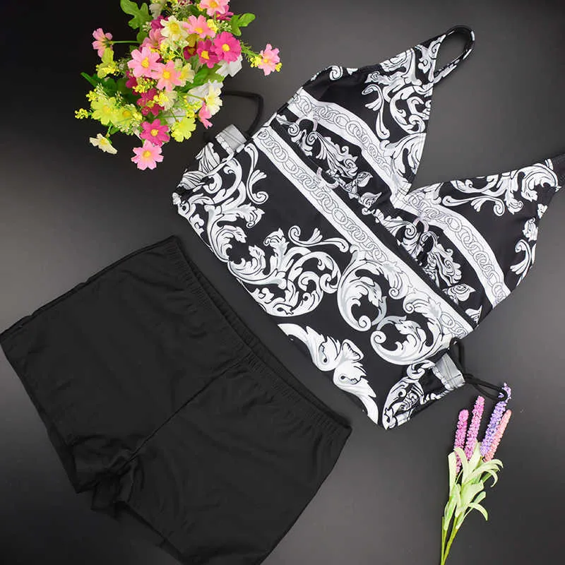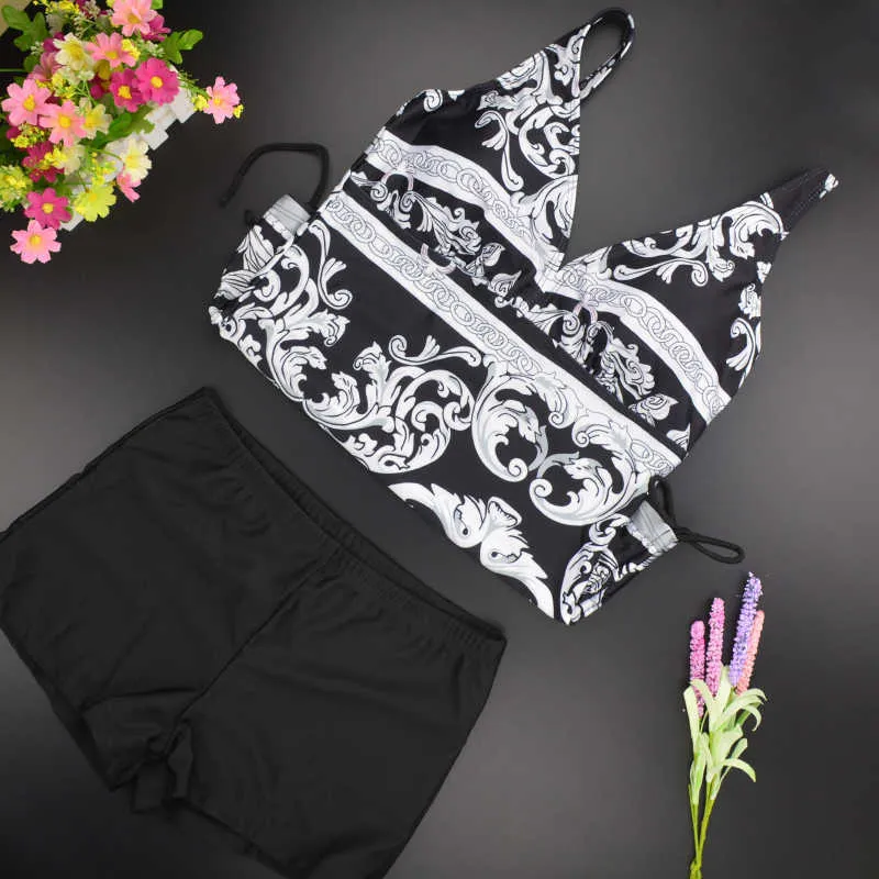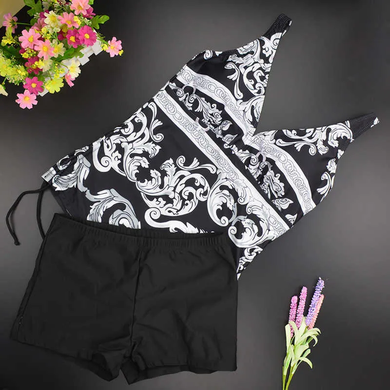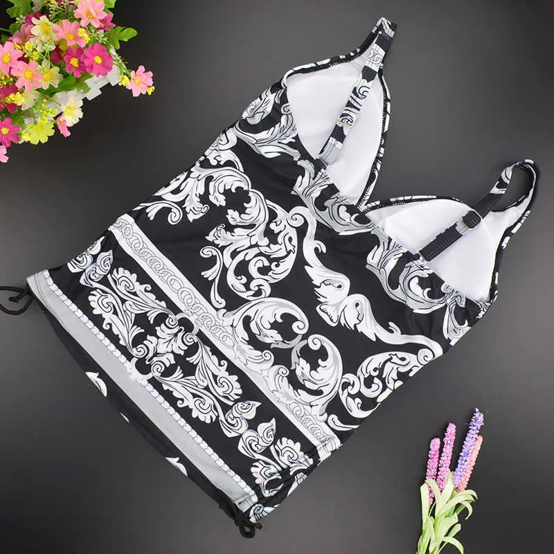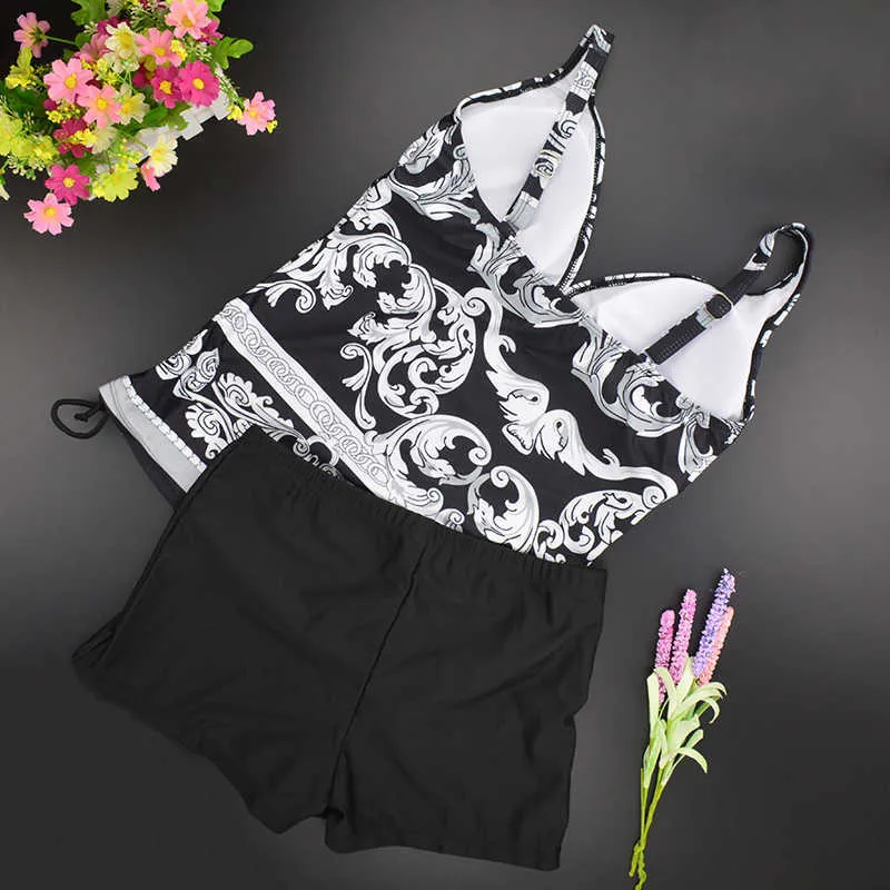 Two Piece Swimwear Women Tankini Swimsuits with Shorts V neck Tankinis Set Swim Wear Black Print Bathing Suit